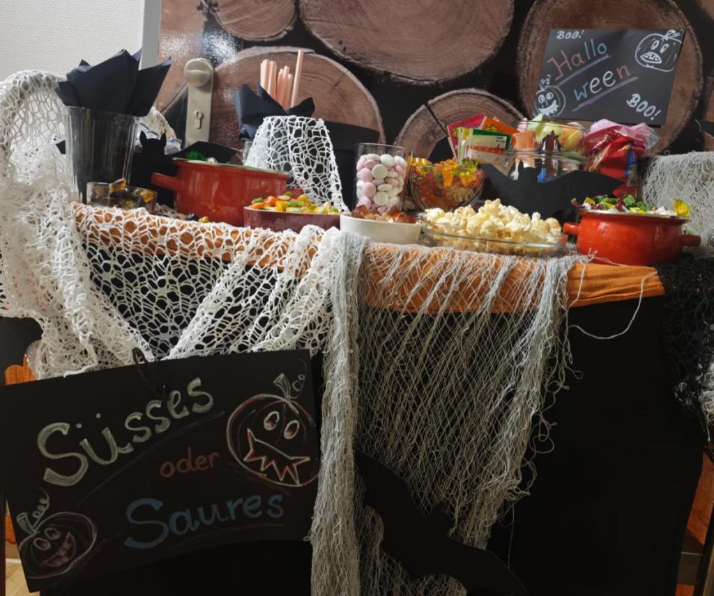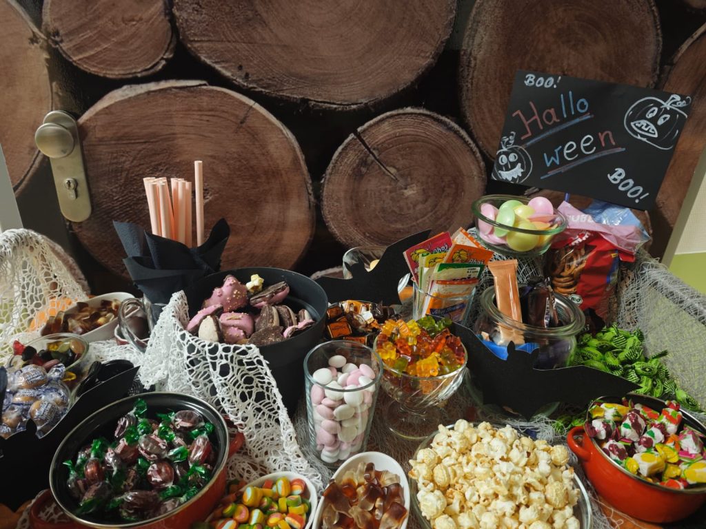 Heute wurde es bei uns richtig gruselig-gemütlich! Unsere Bewohnerinnen und Bewohner konnten sich an unserer liebevoll dekorierten Halloween-Süßigkeitenbar bedienen – mit Schokolade, Bonbons und kleinen Leckereien für jeden Geschmack.